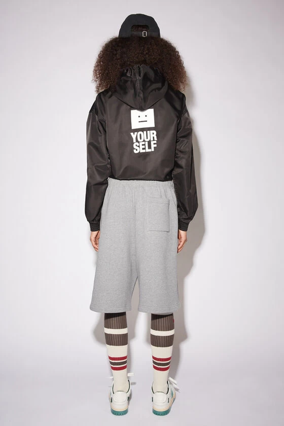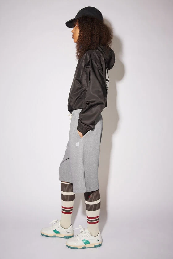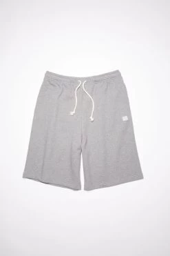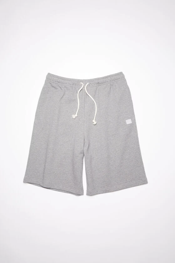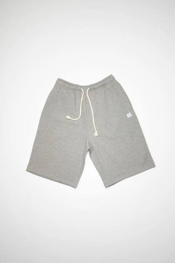 Acne Studios light grey melange fleece sweat shorts are made of cotton with a drawstring elasticated waist, side pockets and an embroidered face patch at the side.