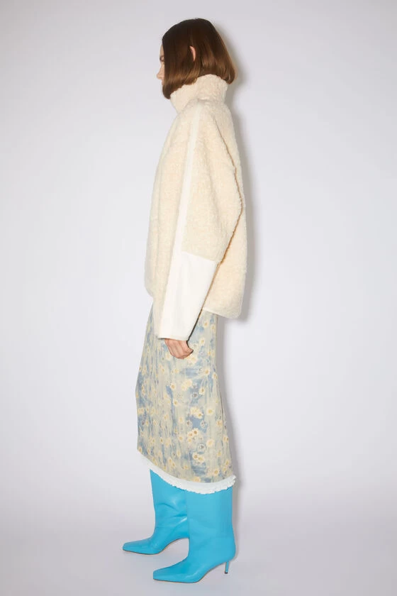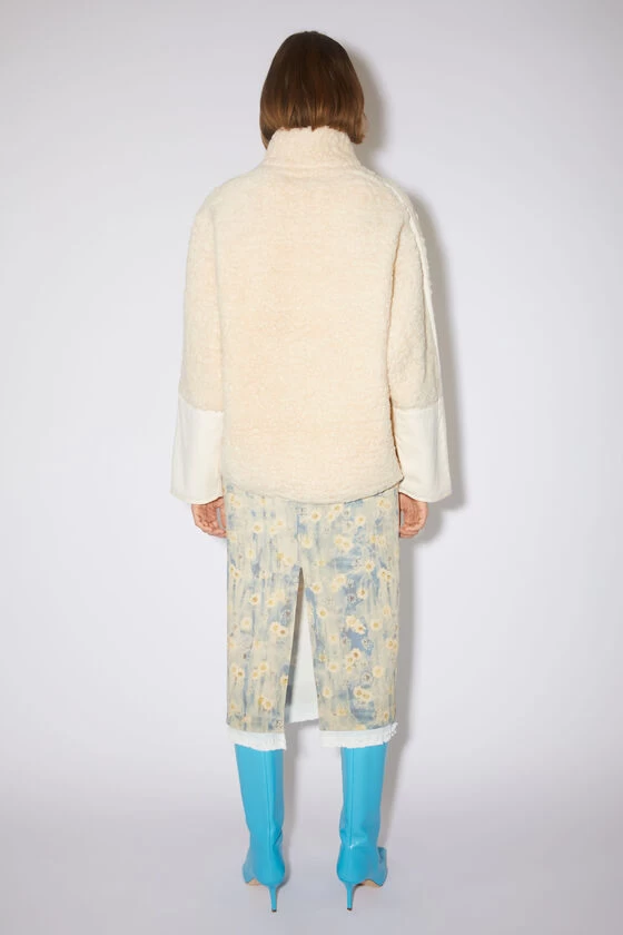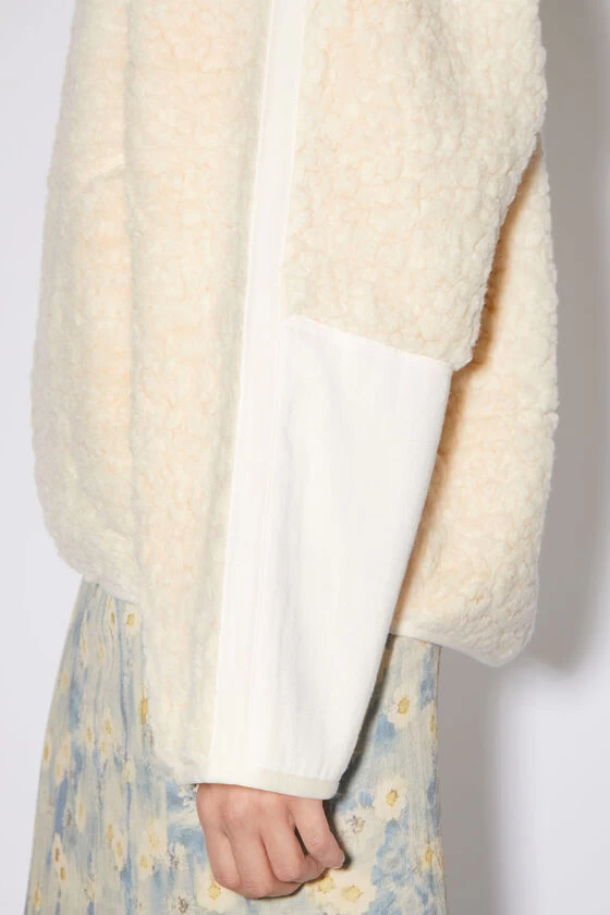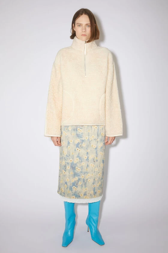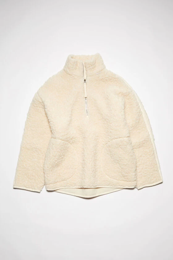 Acne Studios ecru beige polar fleece sweatshirt has a high neck with a label at the base and half-zip closure.