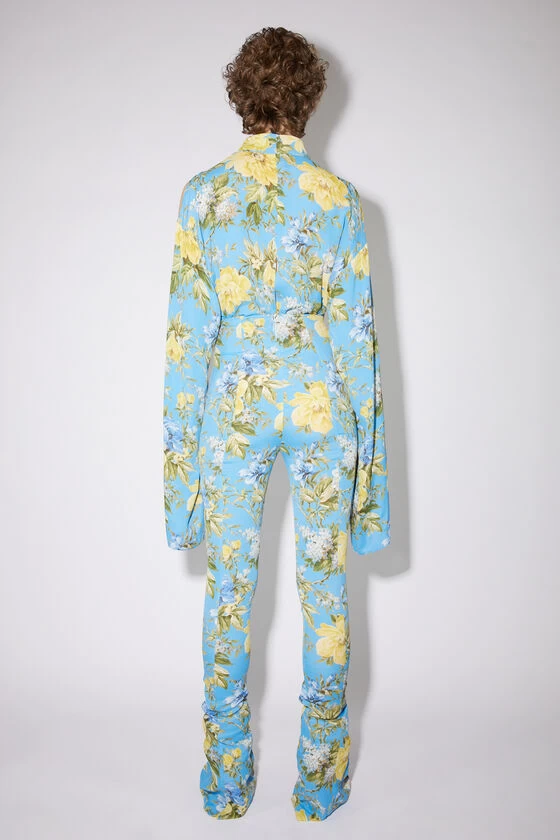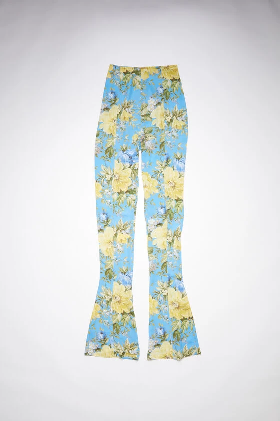 Acne Studios blue trousers feature an all-over exclusive flower artwork print, crafted from a fluid fabric and detailed with discrete zipper closure. Cut to a fitted silhouette with a long flared length.