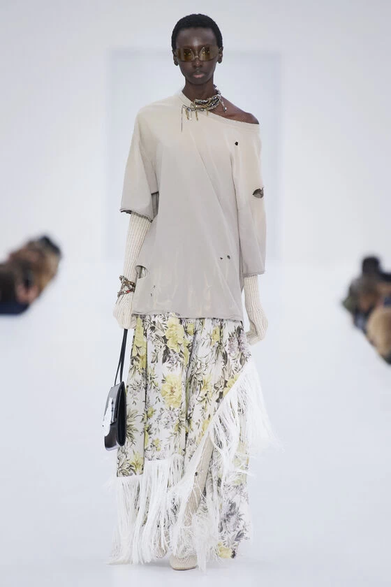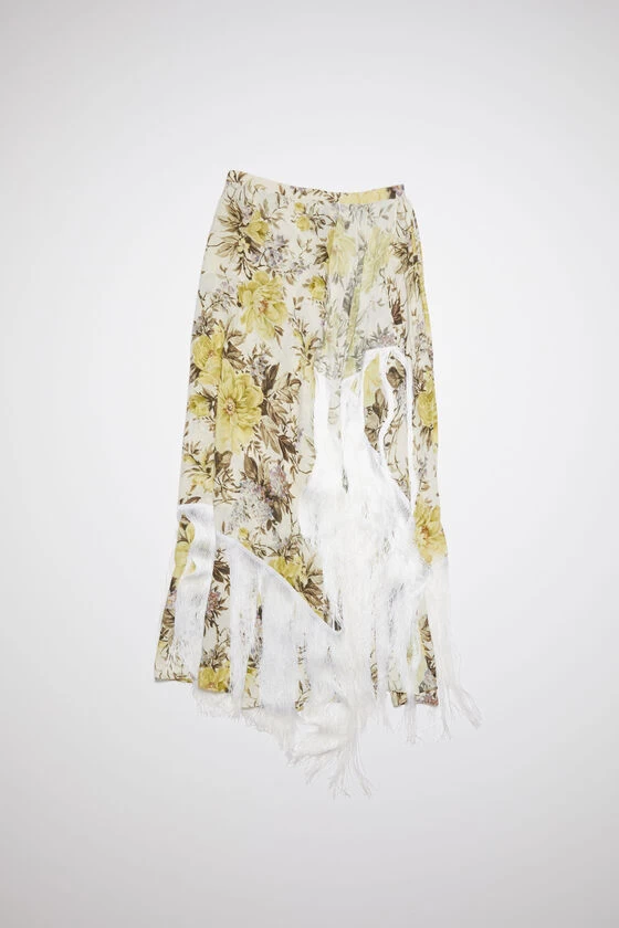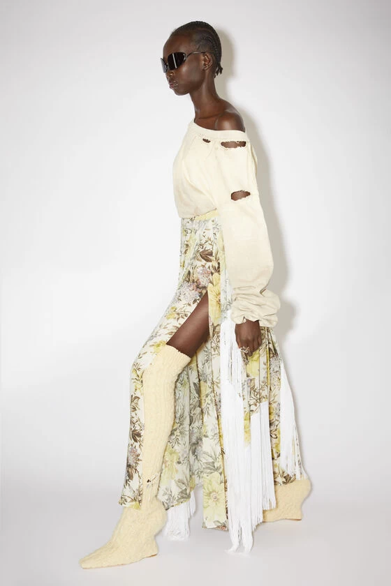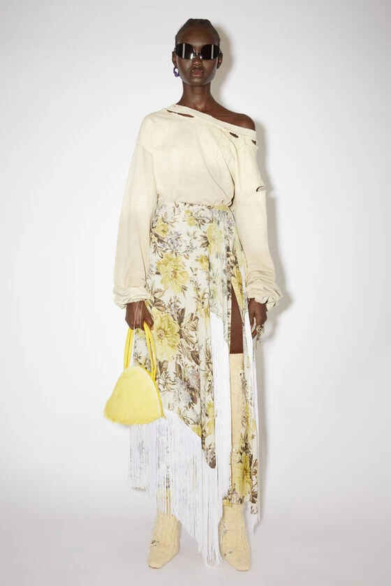 Acne Studios beige skirt features an all-over exclusive flower artwork print and is adorned with fringe detailing with a layering appearance. Crafted from fluid fabric and cut to a relaxed fit with a long length.