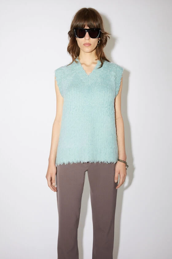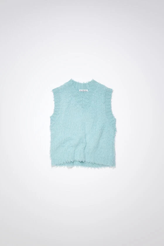 Acne Studios aqua blue gilet jumper is crafted from fluffy merino wool with a rich texture, detailed with a ribbed v-neckline. Cut to a relaxed fit with a hip length.
