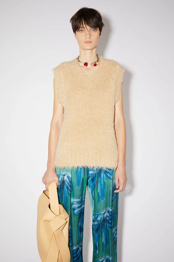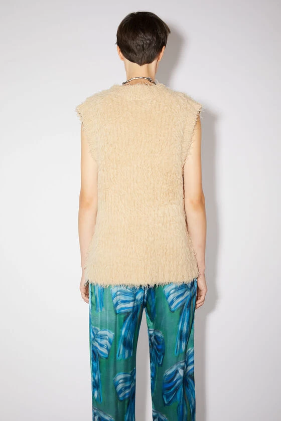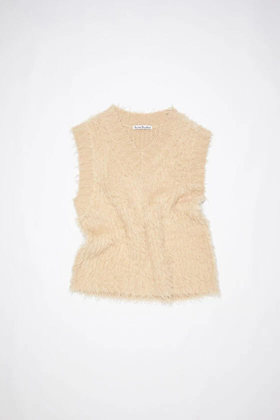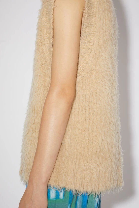 Acne Studios light camel gilet jumper is crafted from fluffy merino wool with a rich texture, detailed with a ribbed v-neckline. Cut to a relaxed fit with a hip length.