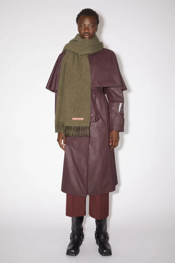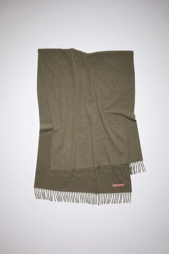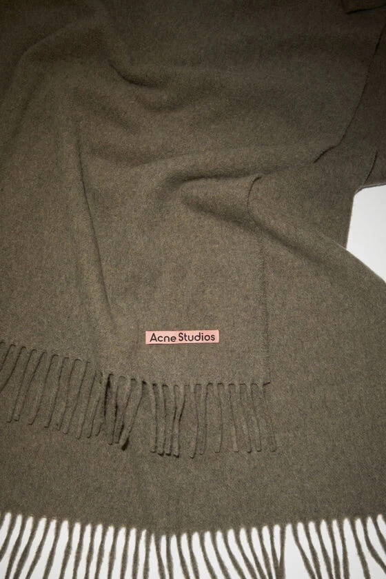 Acne Studios light olive melange fringed scarf is detailed with a pink Acne Studios label and crafted from midweight wool.