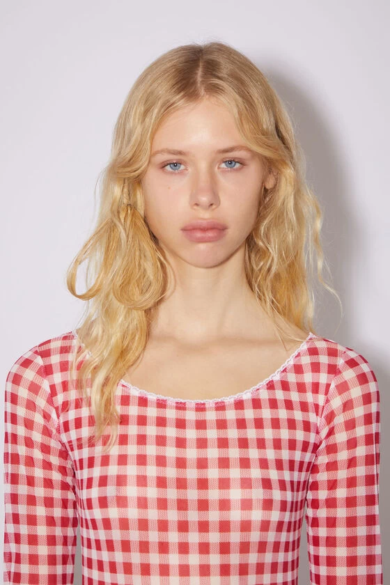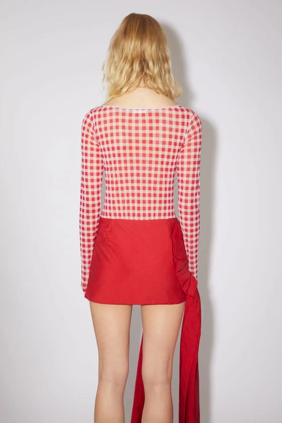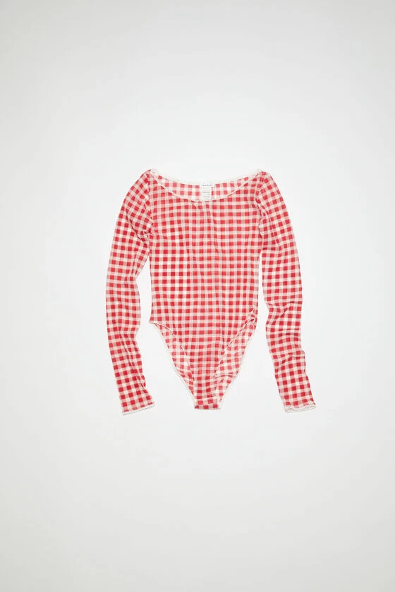 Acne Studios cardinal red body suit features an all-over gingham pattern and is cut to a fitted silhouette.