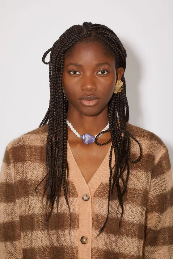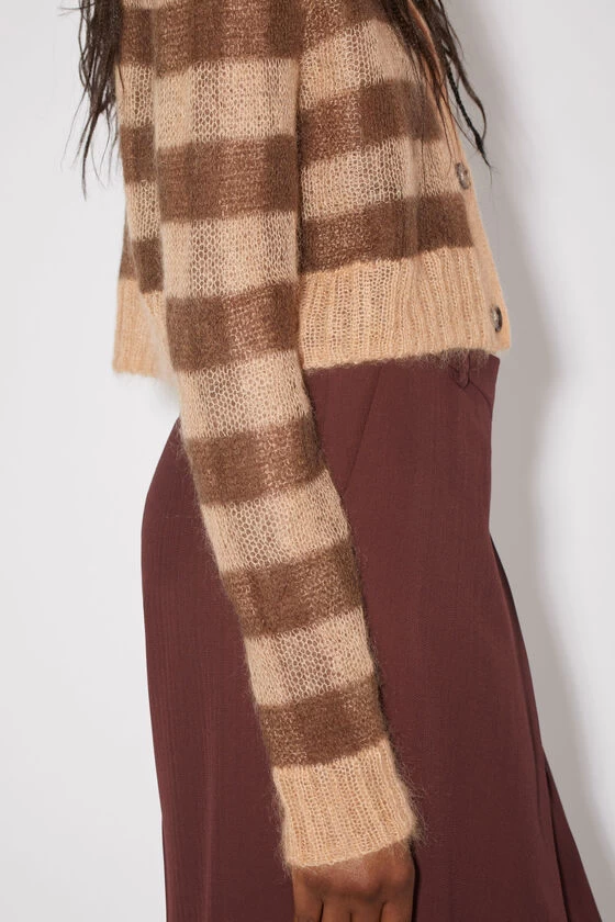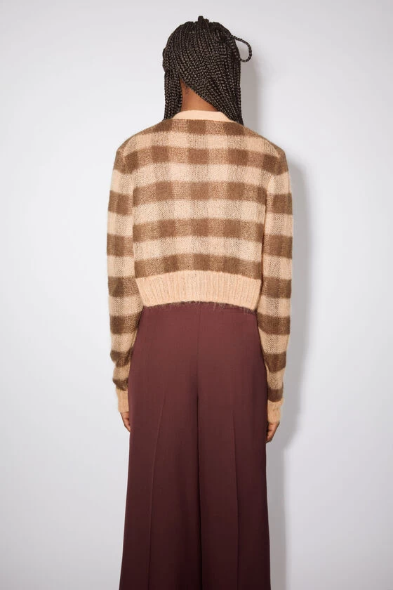 Acne Studios light brown/dark brown cardigan features a gingham pattern and is crafted from an open knit mohair wool blend. Detailed with a v-neckline and centre front button-up closure. Cut to a regular fit with a cropped length.