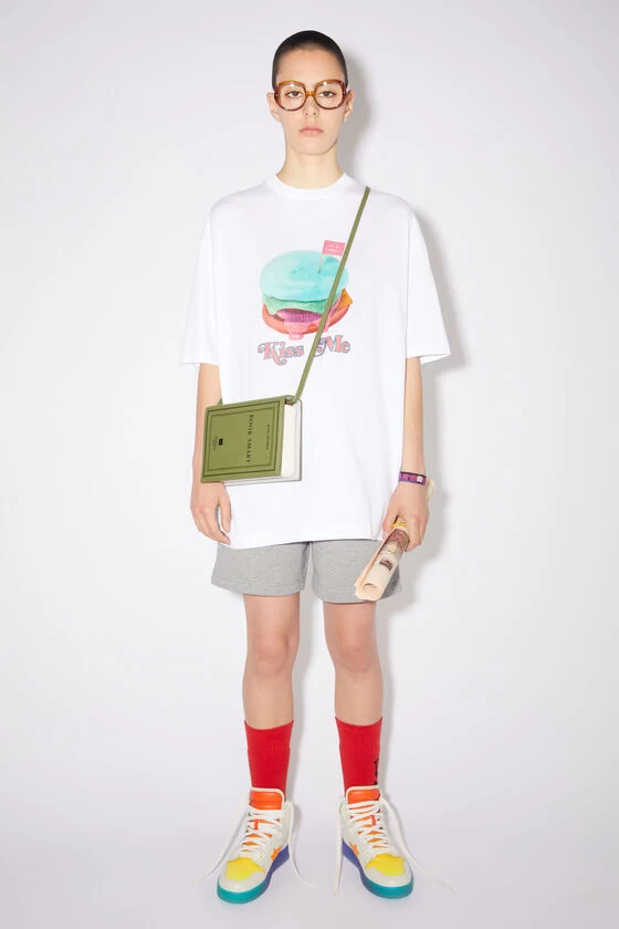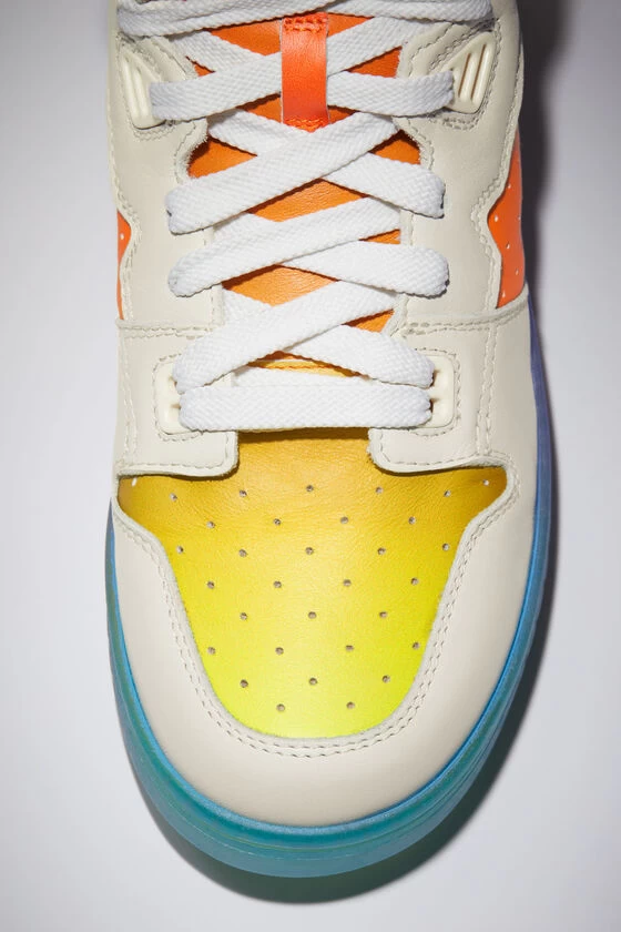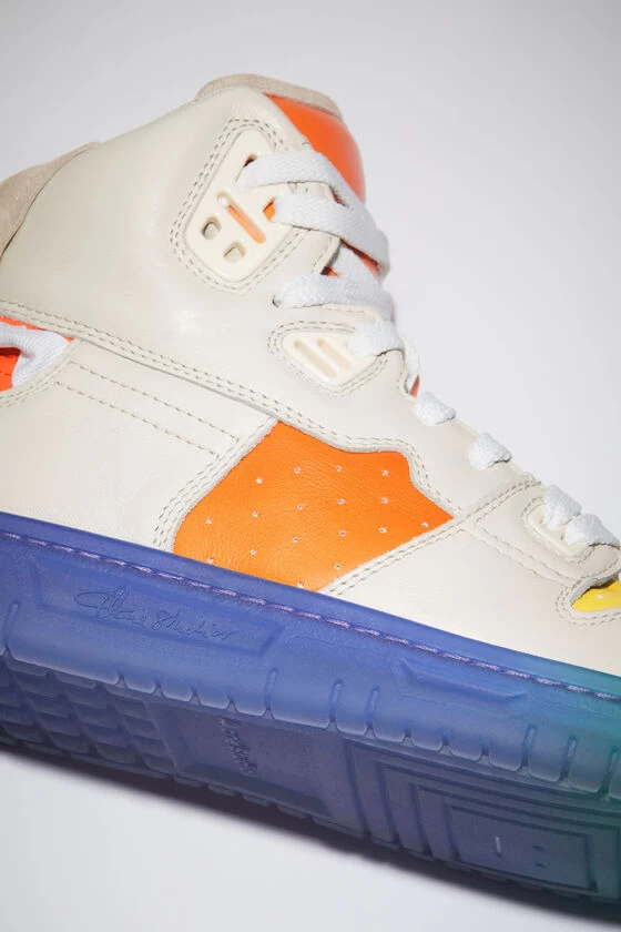 Acne Studios off white/multi high top lace-up sneakers feature a basketball-inspired construction crafted from leather and contrast degrade colour effect details. Adorned with an Acne Studios logo detailing and rubber soles.
