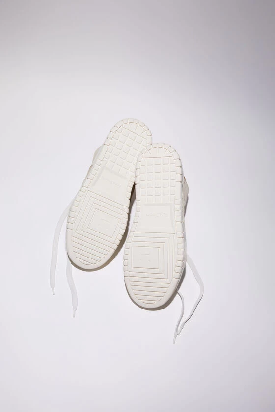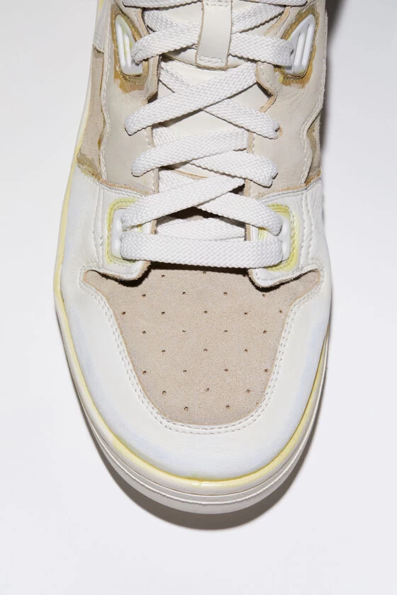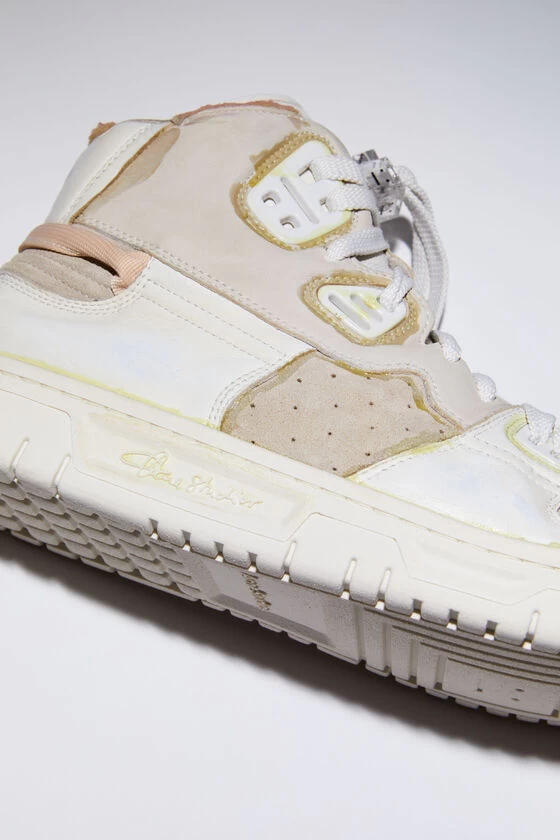 Acne Studios multi/black high top lace-up sneakers feature a basketball-inspired construction. Crafted from leather with contrast suede and nubuck details with a strong wash finish. Adorned with an Acne Studios logo detailing and rubber soles.