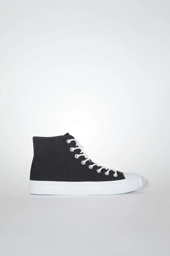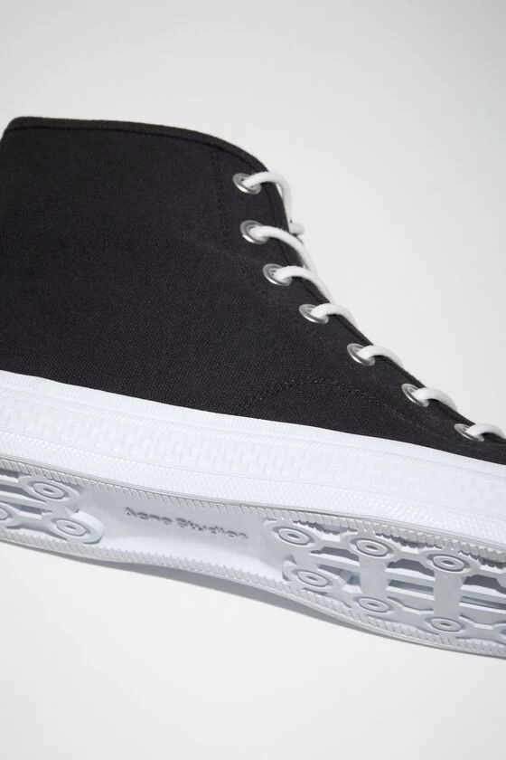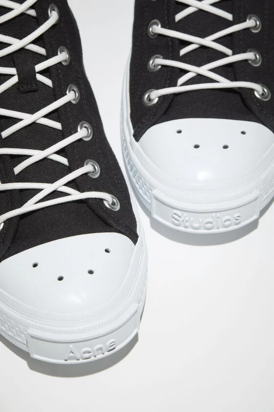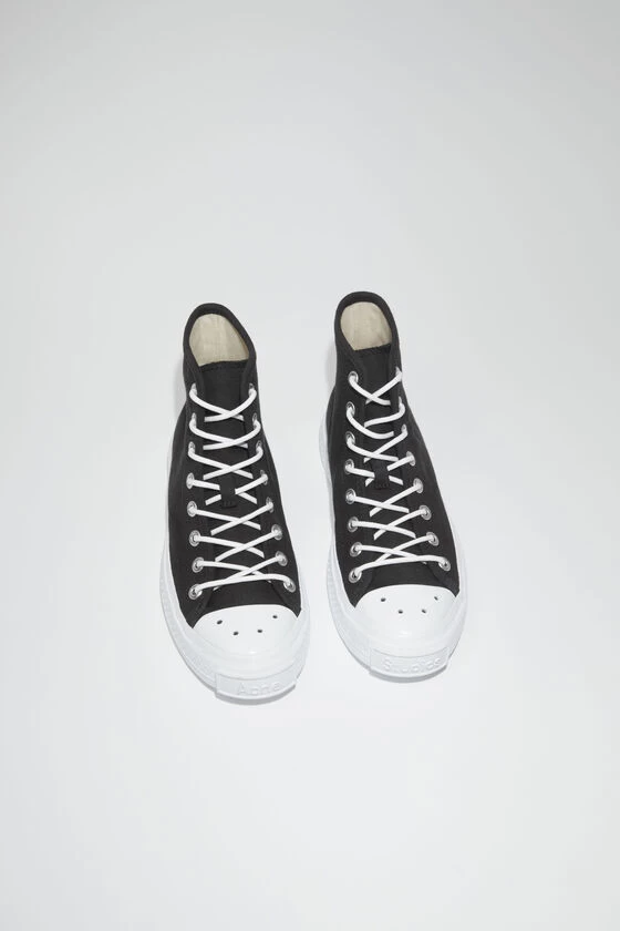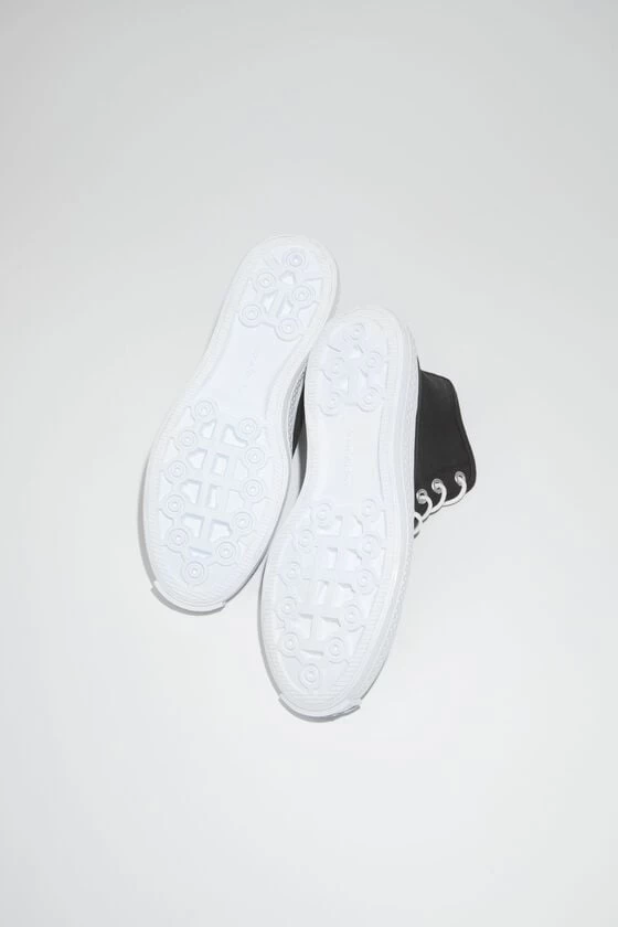 Acne Studios black/off white high top sneakers are crafted from organically grown cotton with rubber soles. Completed with a branded logo tag on the front.