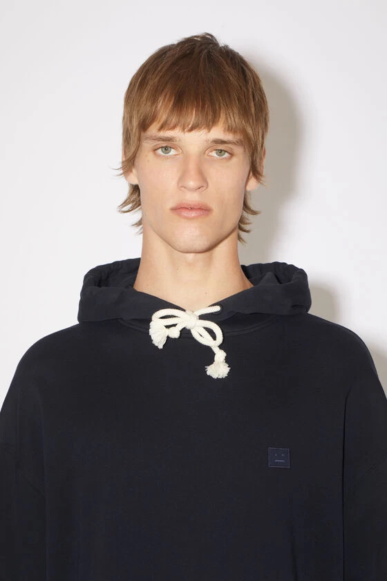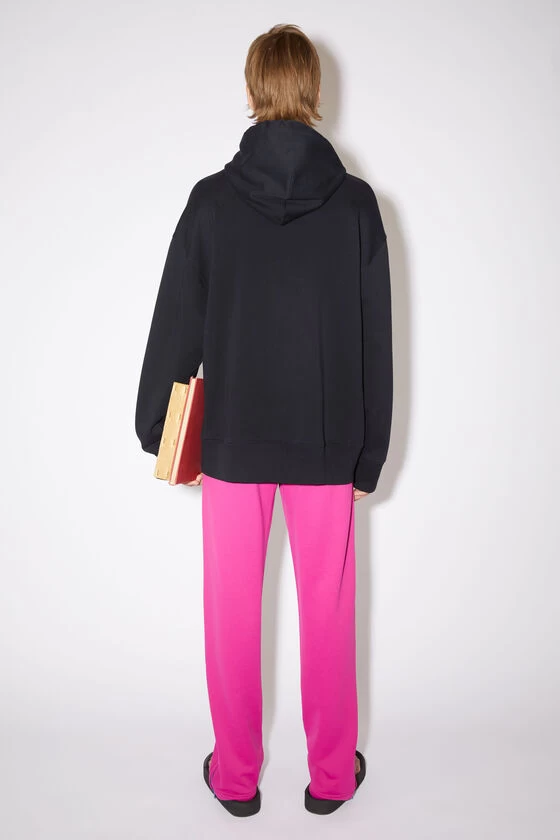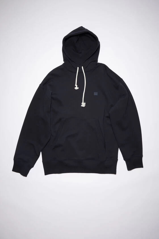 Acne Studios black hooded sweatshirt features a kangaroo pocket with ribbed binding and a face logo patch on the chest. Crafted from midweight fleece cotton and cut to an oversized unisex fit.