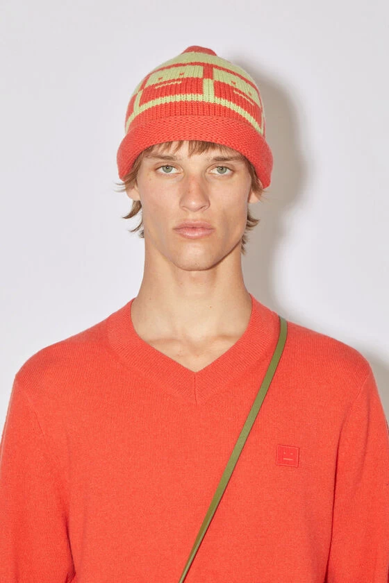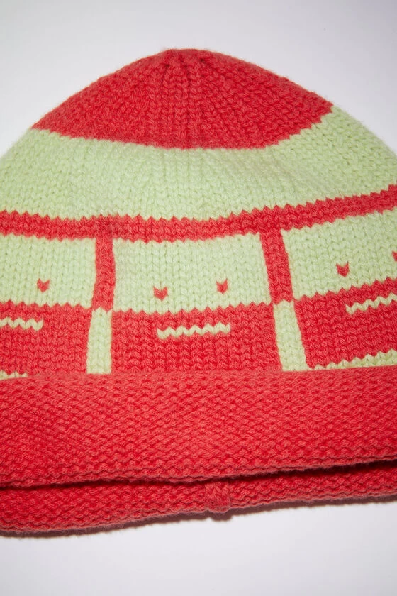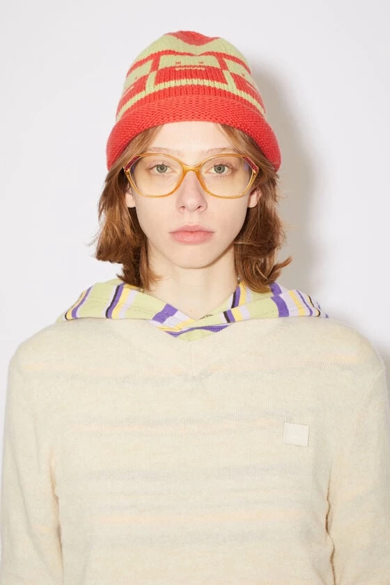 Acne Studios sharp red/pale green beanie features a stripe pattern and face logo checkboard detailed. Crafted from chunky wool, and detailed with a wide roll-up edge.