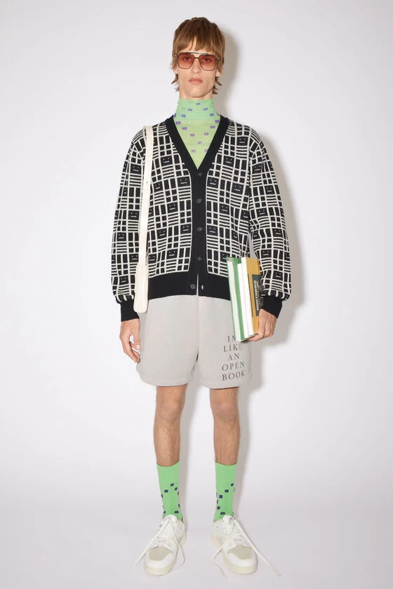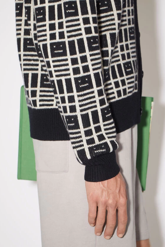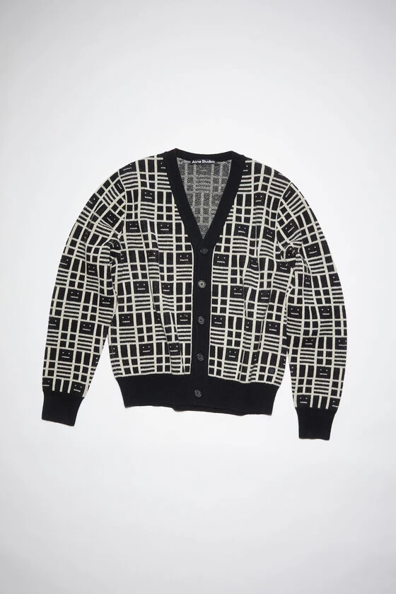 Acne Studios black cardigan features a face logo checkboard pattern and is detailed with a v-neckline. Crafted from wool and complete with a tonal button-up front closure. Cut to a regular unisex fit and a slightly cropped length.