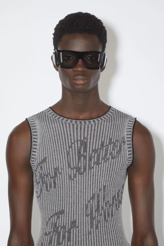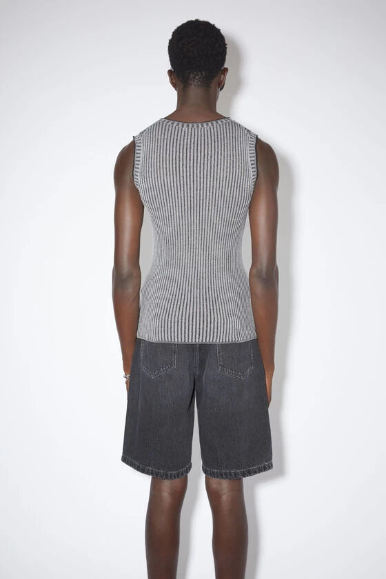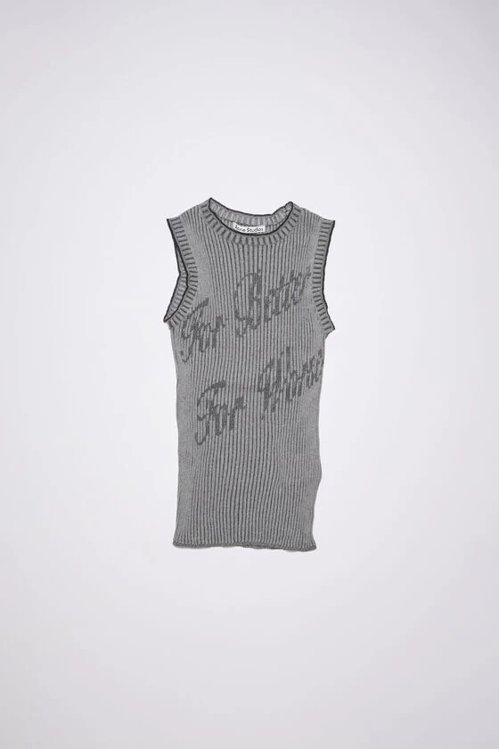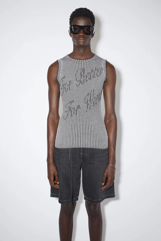 Acne Studios anthracite grey knitted ribbed vest is crafted from a cotton blend and detailed with a front ‘For Better For Worse’ plaited jacquard stitch. Cut to a fitted fit and hip length.