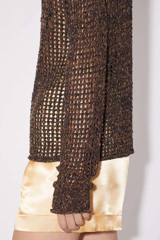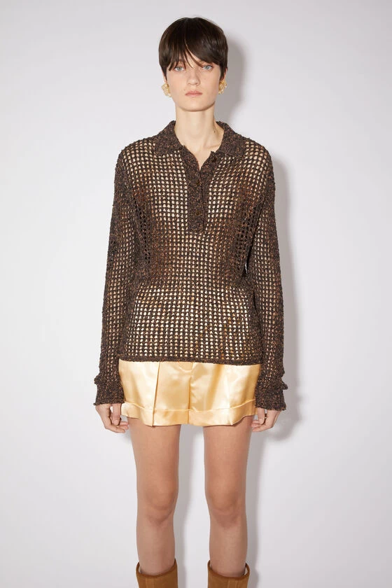 Acne Studios tobacco brown polo shirt features a knitted tonal yarn with a crochet knit finish and a semi-sheer appearance, complete with a button-up closure at the front. Cut to a relaxed fit and hip length.