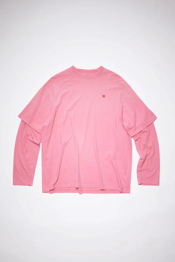 Acne Studios bubblegum pink t-shirt is crafted from knitted jersey cotton with a faded finish and features layered under sleeves. Detailed with a front micro face logo patch and face logo embroidery on the back. Cut to a relaxed unisex fit and a regular length.