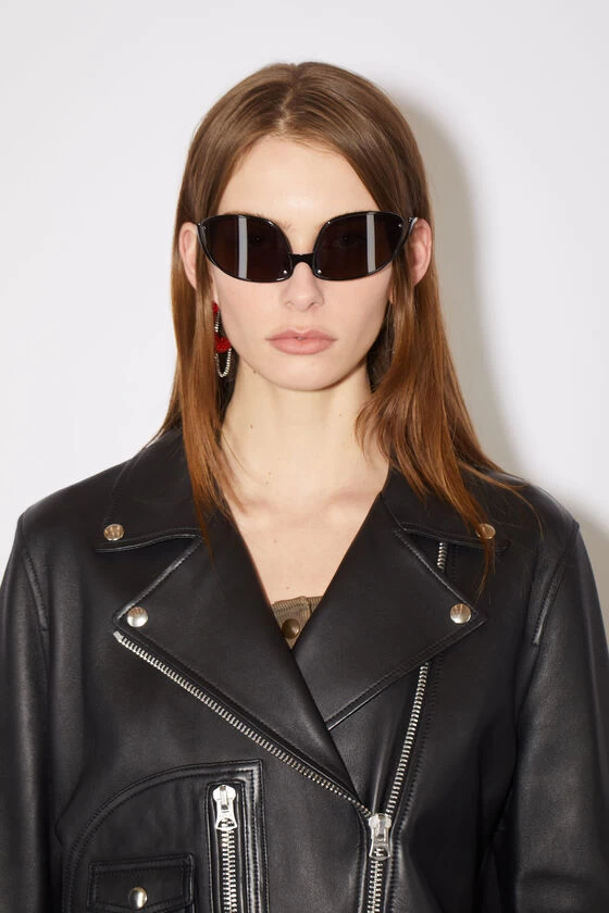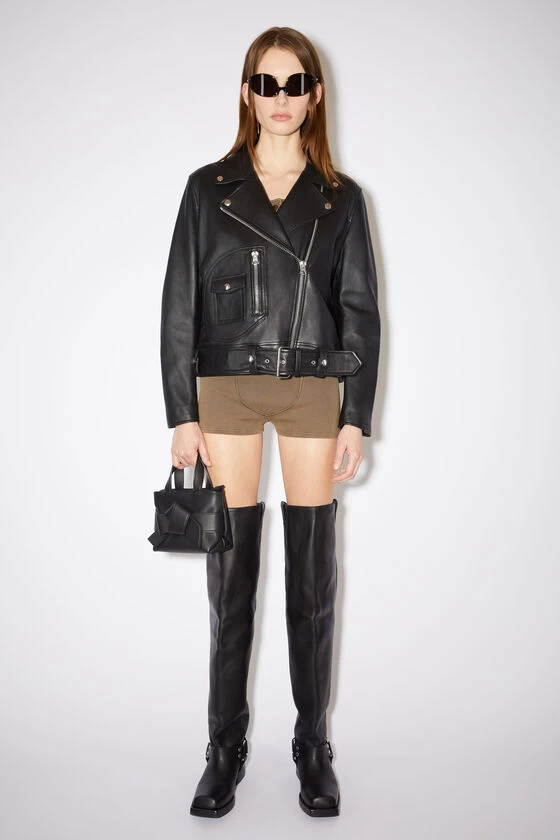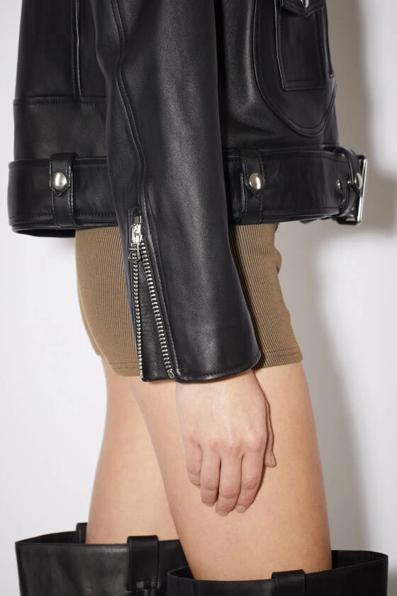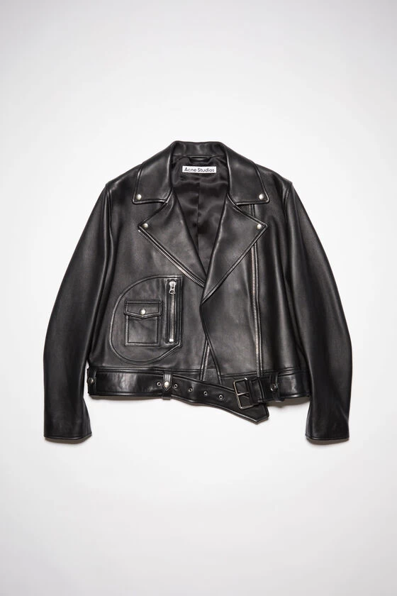 Acne Studios black leather biker jacket is crafted from leather and silver-tone hardware details. Cut to a regular fit and completed a belted waist, zippered patch and a full lining.