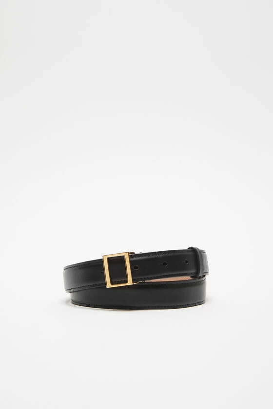 Acne Studios black/gold belt is crafted from leather and features a gold-toned square buckle detailed with a logo engraving.
