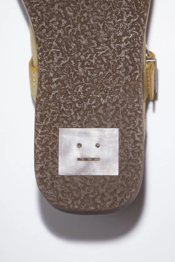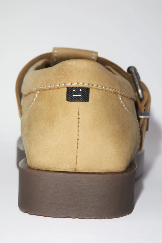 Acne Studios khaki beige shoes feature a mary jane construction with a round toe, crafted from soft nubuk leather. Complete with a buckle belt closure and chunky rubber soles.
