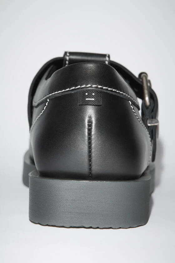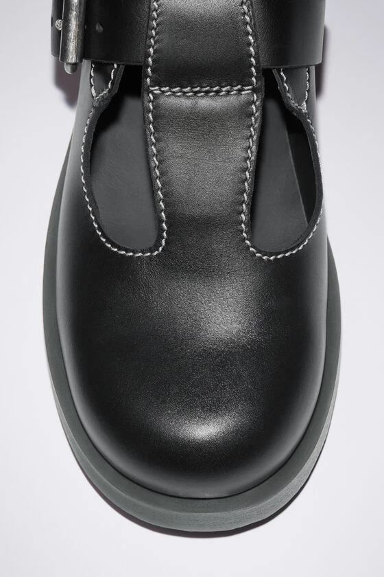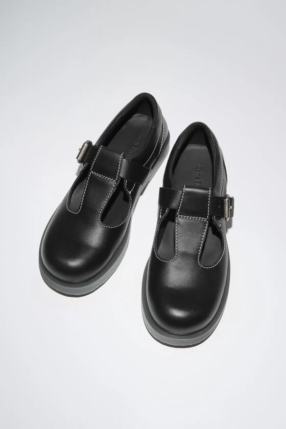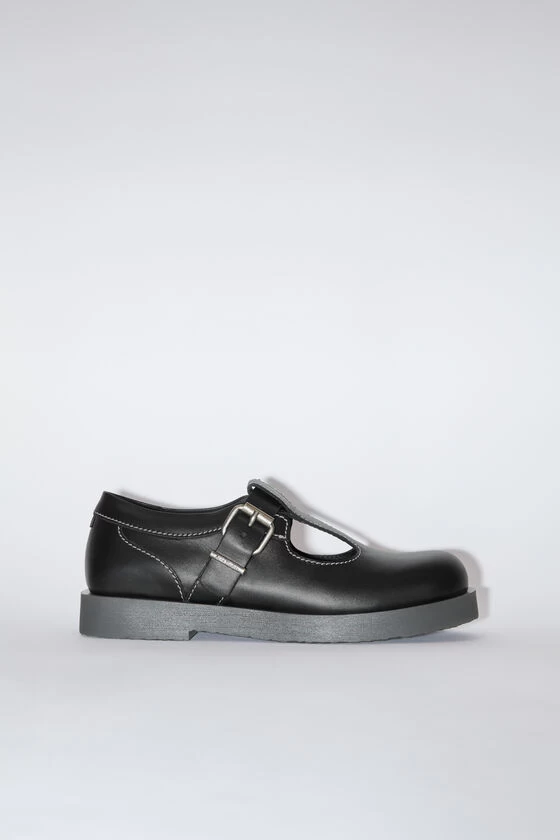 Acne Studios black shoes feature a mary jane shoe construction with a round toe, detailed with a silver-toned roller buckle. Crafted from leather and chunky rubber soles.