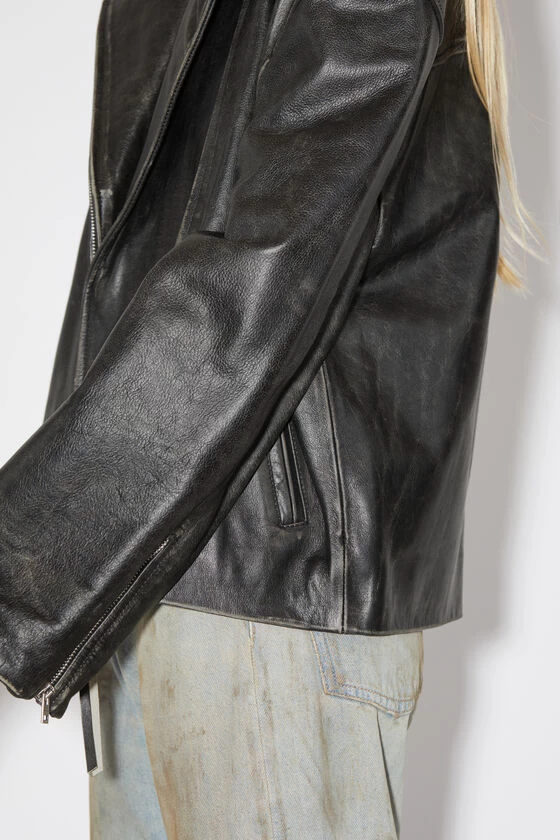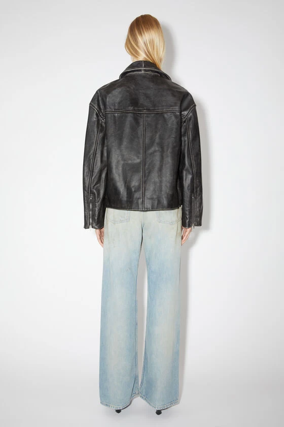 Acne Studios black double-breasted jacket features a biker-style construction, crafted from leather with a pigmented finish. Complete with a zippered closure and side jet pockets. Cut to a relaxed fit and regular length.