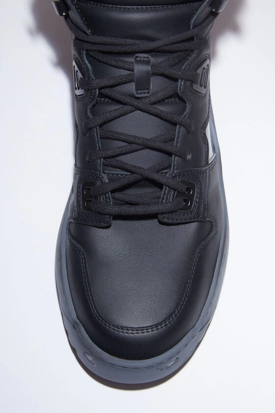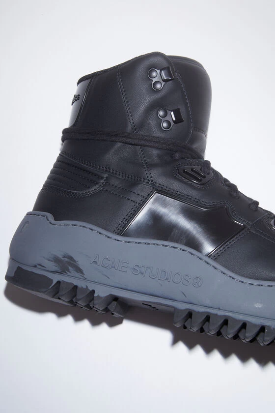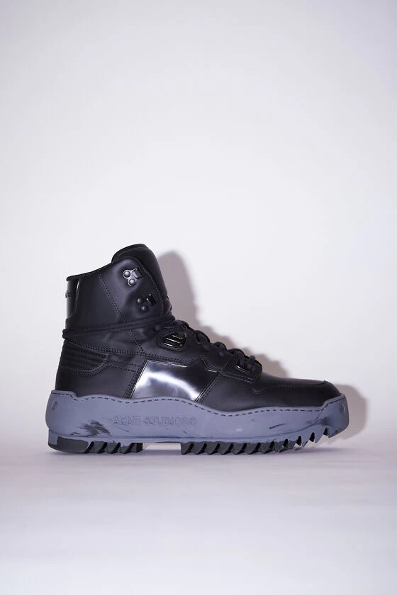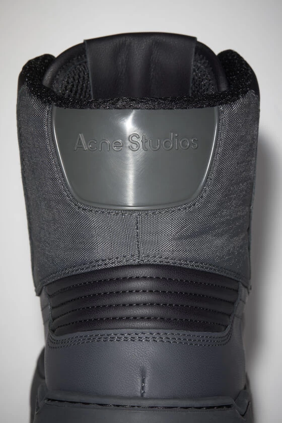 Acne Studios multi anthracite high- top sneakers are crafted from gummy leather and ripstop nylon trims. Complete with a platform rubber sole and detailed with a branding logo on the soles.