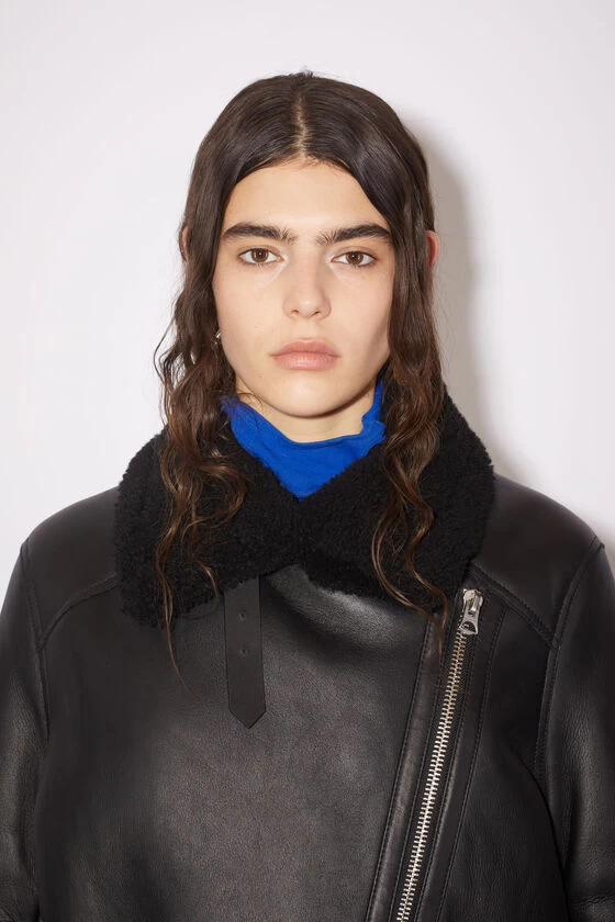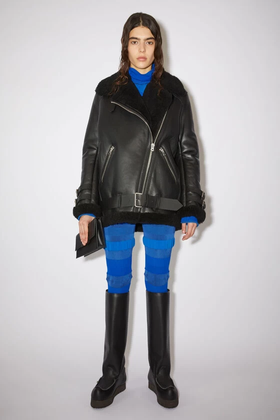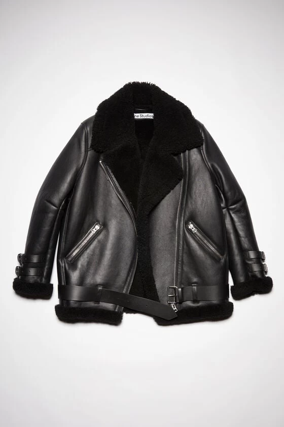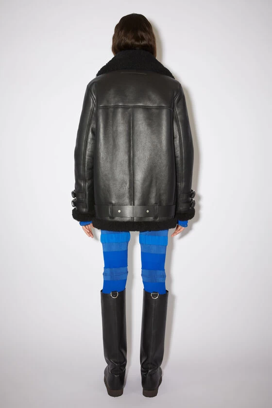 Acne Studios black/black aviator jacket is crafted to an oversized silhouette with soft lamb shearling and accented with buckled smooth leather straps at the neck, cuffs and hem.