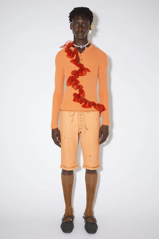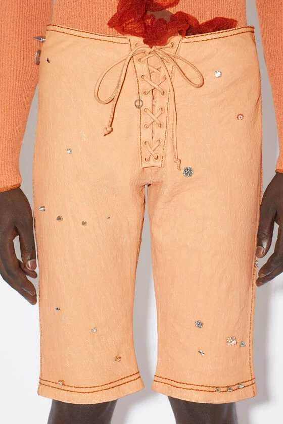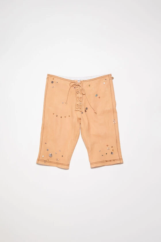 Acne Studios ecru beige shorts features a front lace-up closure with eyelets and back pockets detailed with decorative top stitching. Crafted from grainy leather and cut to a fitted fit, low rise and knee length.