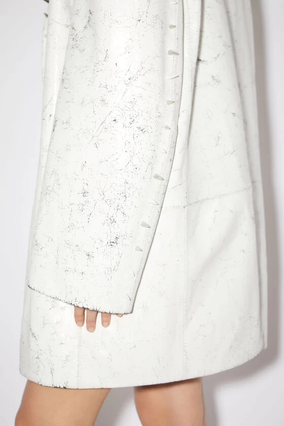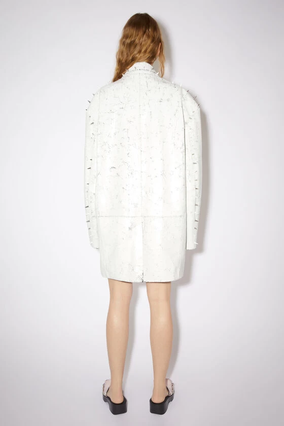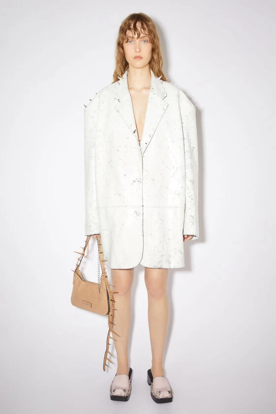 Acne Studios cold white single-breasted tailored jacket is crafted from leather, detailed with metal stud detailing. Cut to a relaxed fit with dropped shoulders and over the hip length.