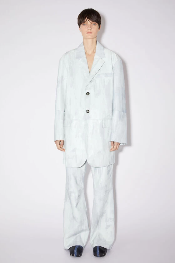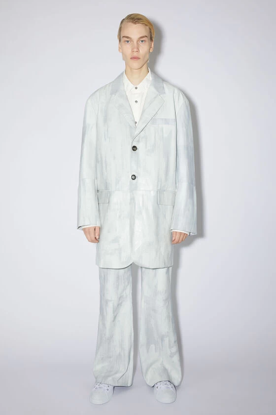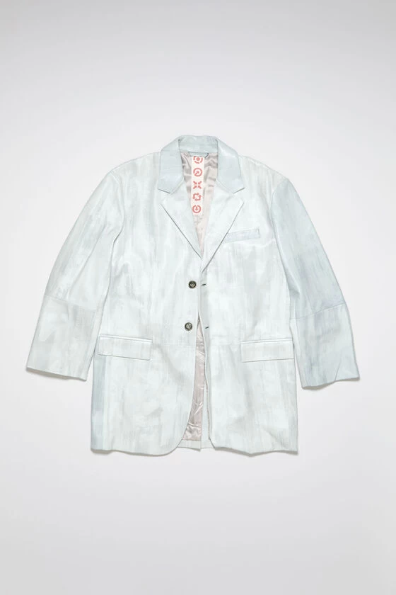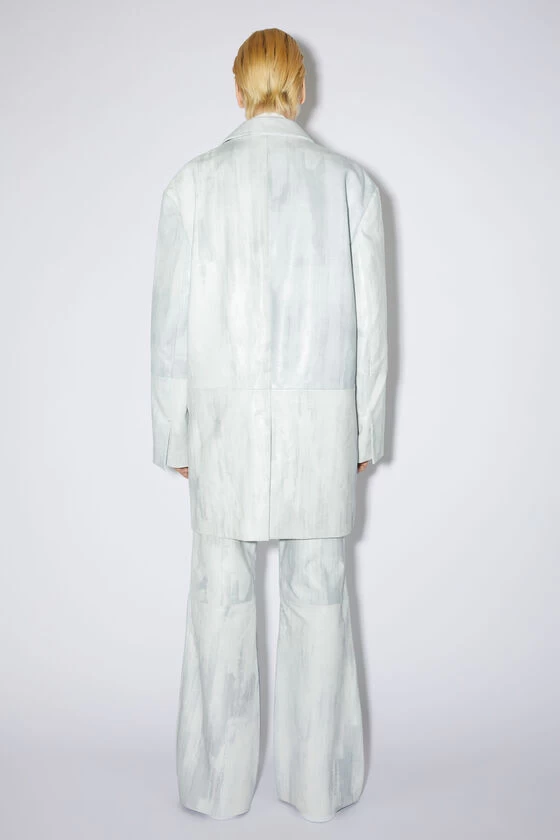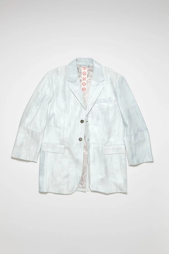Acne Studios cold white single-breasted jacket is crafted from leather with a painted effect, constructed entirely from excess fabric and materials. Detailed with a button-up closure, chest welt pocket and side flap pockets.