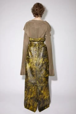 Acne Studios black skirt is crafted from leather with a painted effect, constructed entirely from excess fabrics and materials. Detailed diagonal panels and a zipper closure. Cut to a regular fit with a mid length.