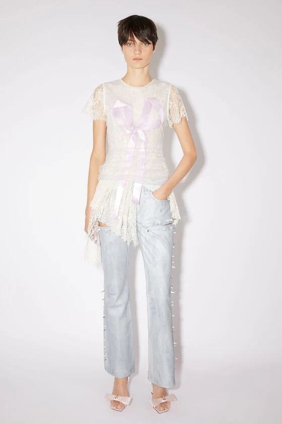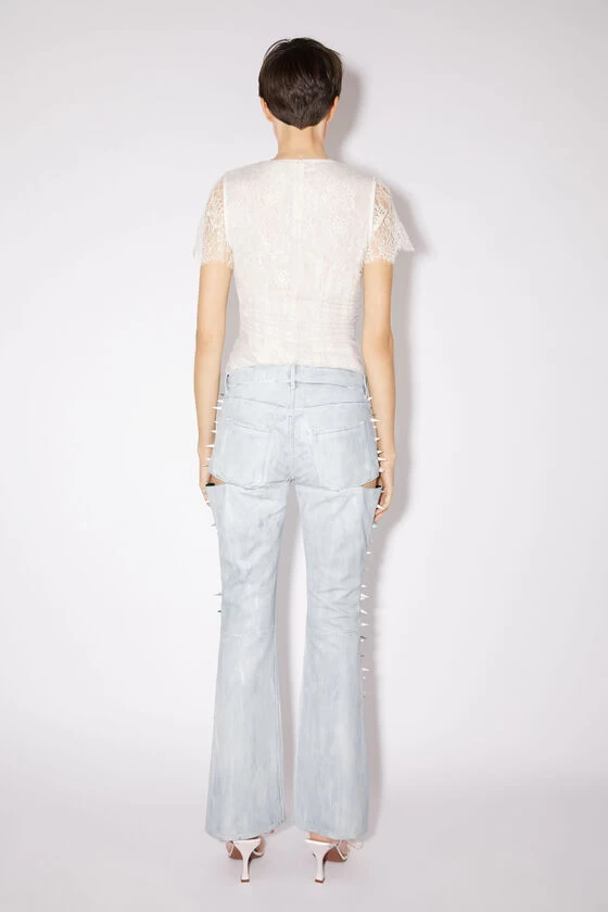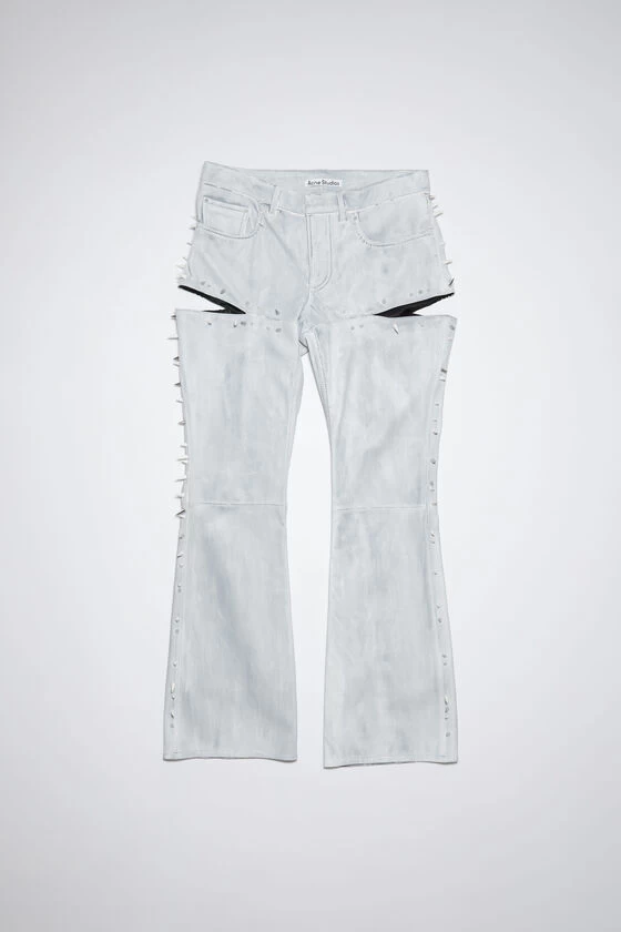 Acne Studios light blue leather trousers feature a 5-pocket construction, detailed with decorative spikes on the side with slits at the hip. Crafted from leather with a hand-painted pastel top coat finish. Cut to a regular fit with a low rise, boot cut leg and long length.