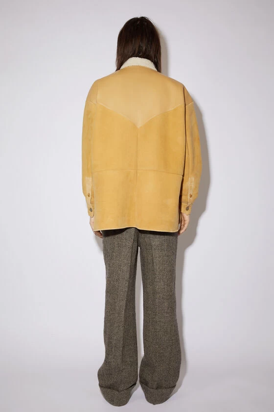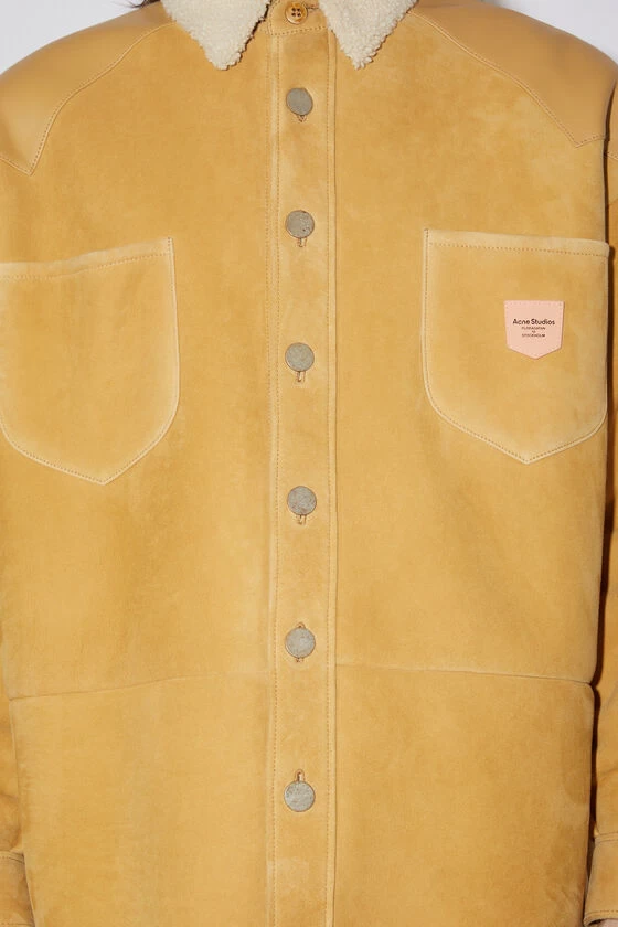 Acne Studios straw yellow overshirt is crafted from suede leather and detailed with shearling fur trims. Detailed with chest patch pockets and a snap button-up closure. Cut to an oversized silhouette with elongated sleeves and a regular length.