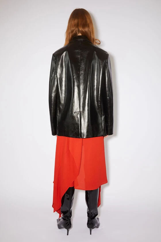 Acne Studios black single-breasted suit jacket is crafted from leather with a gloss finish. Detailed with a front button-up closure, flap front pockets and a chest pocket. Cut to a relaxed fit with a mid-length.