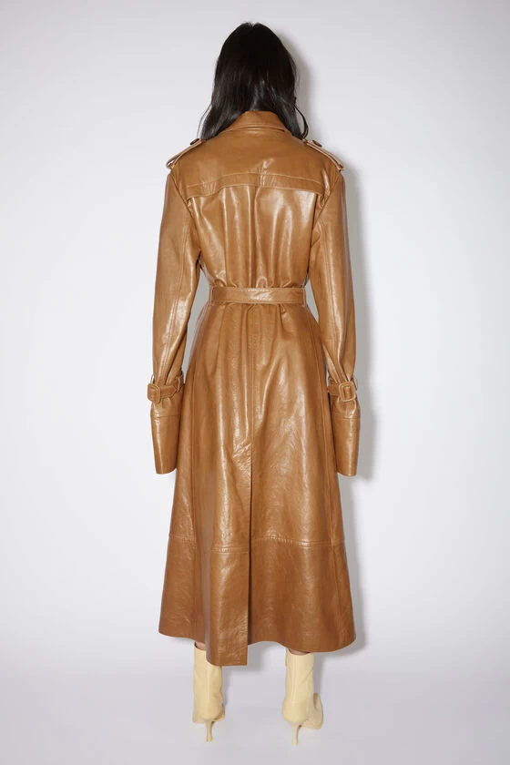 Acne Studios off cognac brown double-breasted trench coat is crafted from leather, detailed with buckle on the sleeves and front side. Complete with a button-up front closure and belted waist. Cut to a regular fit with a long length.