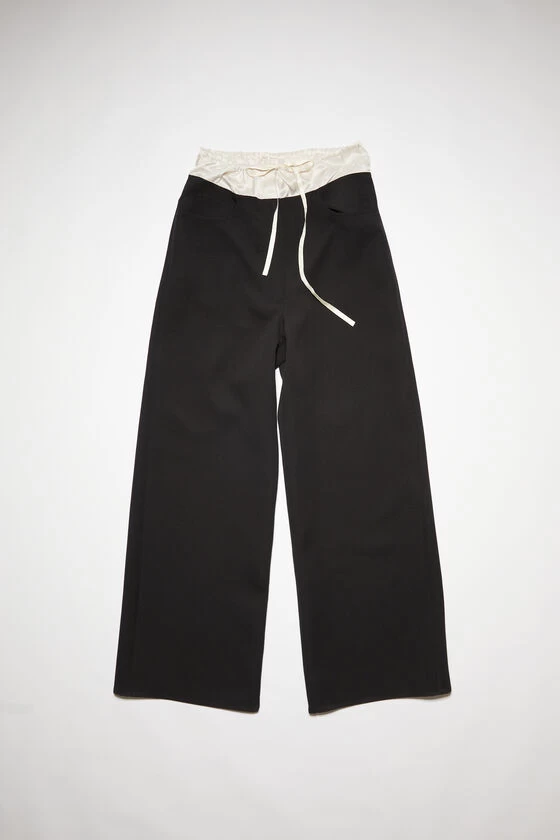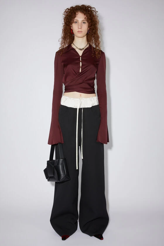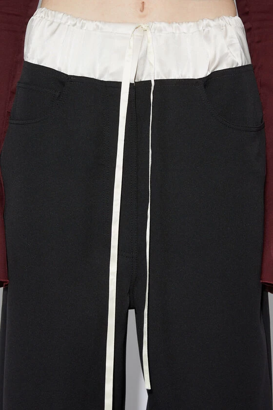 Acne Studios black straight leg trousers are made of leather with a grained, natural appearance and a high rise fit.