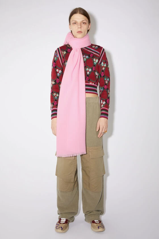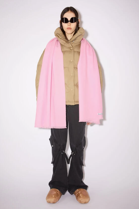 Acne Studios pale pink scarf is made of soft, lightweight wool with subtly fringed edges and is detailed with an Acne Studios label.