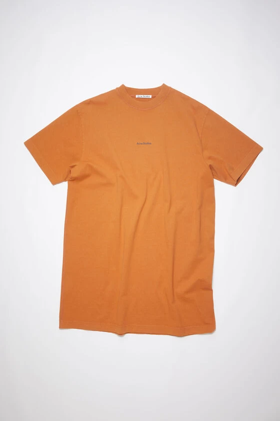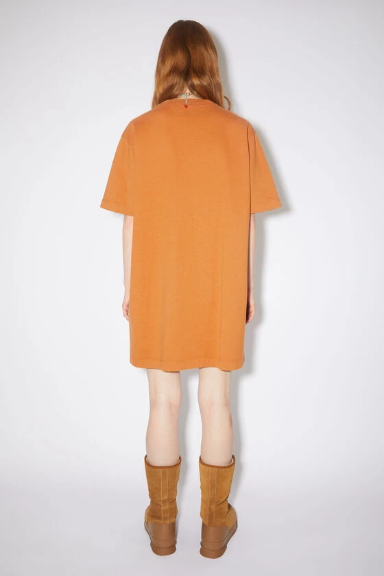 Acne Studios burnt orange short sleeve t-shirt dress is cut to a straight fit, with dropped shoulders and crafted from a midweight jersey made of cotton. Detailed with a contrast Acne Studios logo stamp on the front and ribbed crew neck.