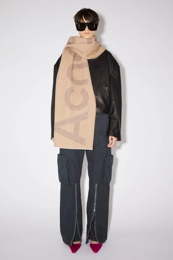 Acne Studios camel brown logo scarf is crafted from a wool blend with a soft feel, adorned with an Acne Studios logo and detailed with short frayed edges.