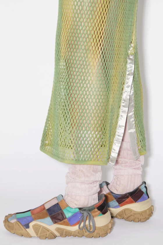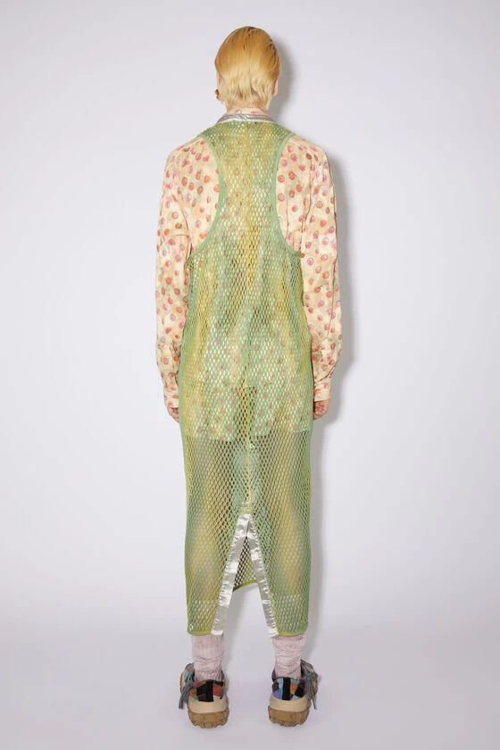 Acne Studios lime green sleeveless overshirt features a two-tone vertical strip dye on the netting, details with a metal zipper and leather tab and contrast satin neckline and bottom hem. Cut to a relaxed fit with a long length.