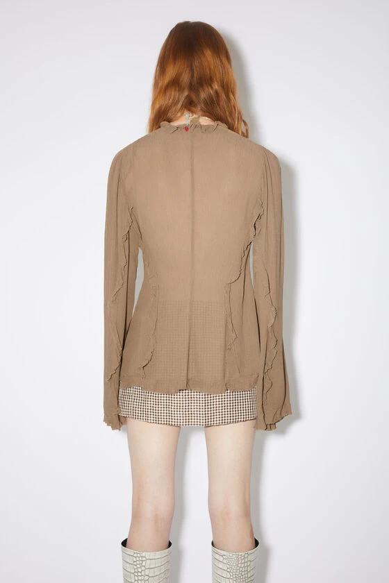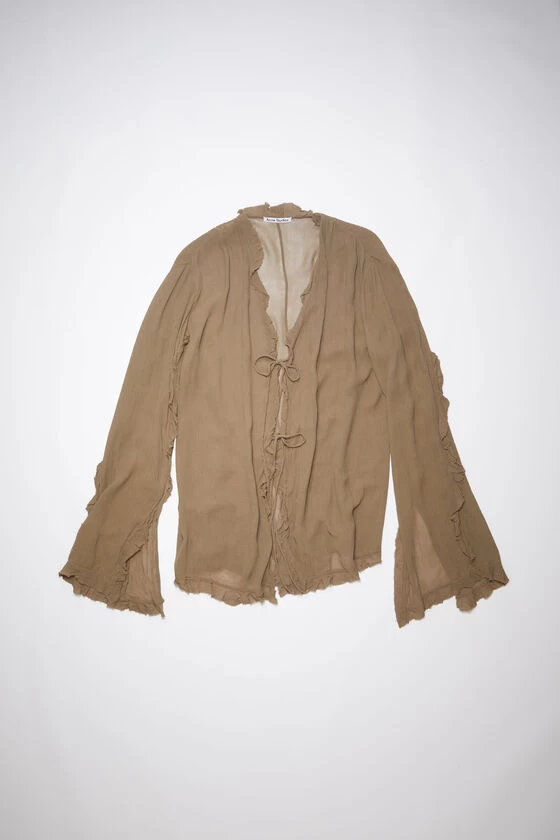 Acne Studios mud green long sleeve blouse features a front tie-up opening, detailed with ruffles and sleeve slits. Cut to a relaxed fit and hip length.