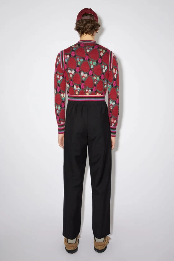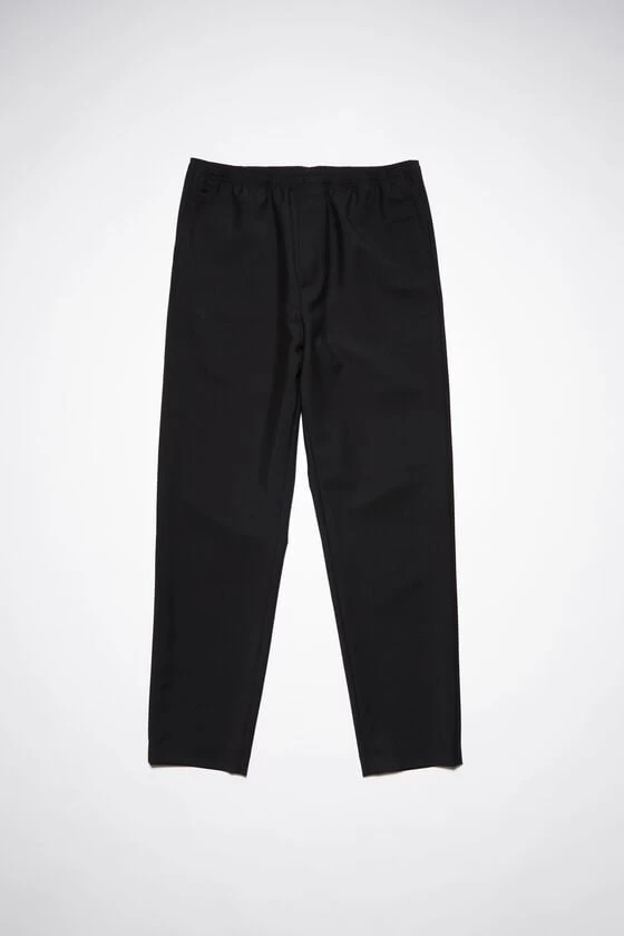 Acne Studios black tailored trousers feature a loose silhouette, detailed with an elasticated waistband with drawstring, made of wool-blend. Completed with slanted front pockets and a back patch pocket.