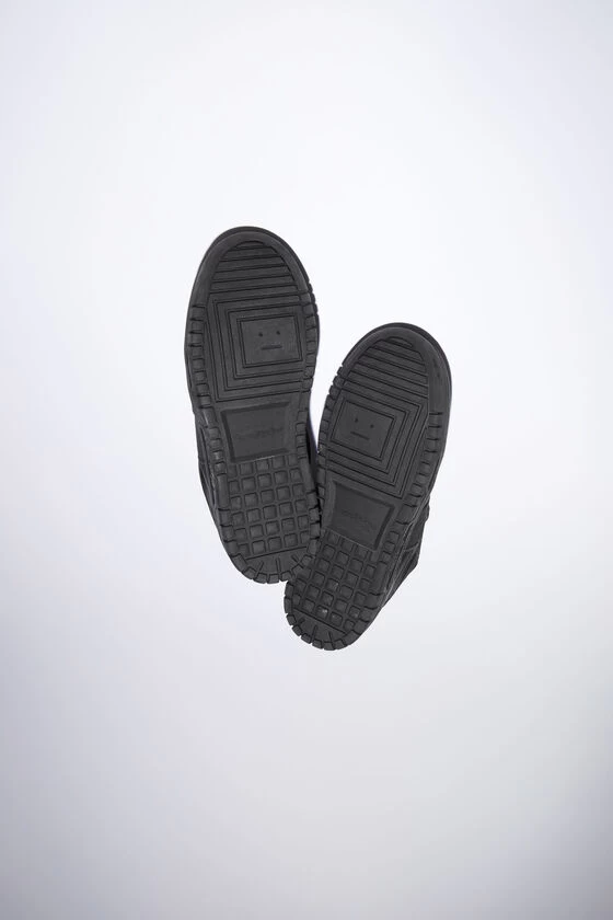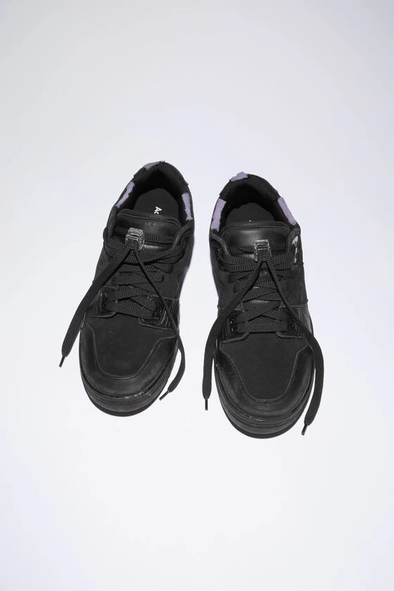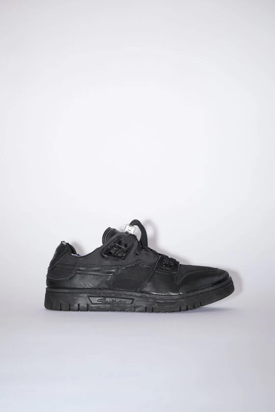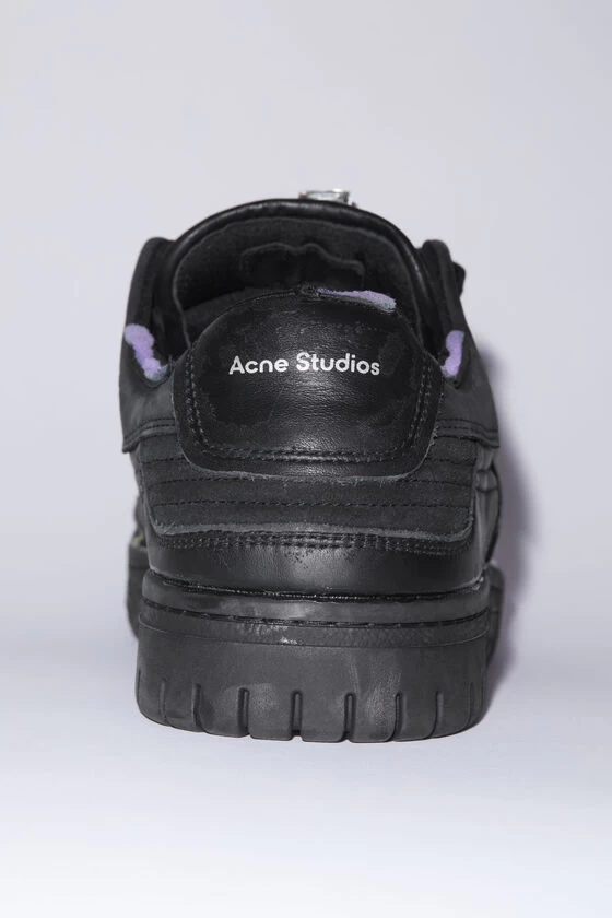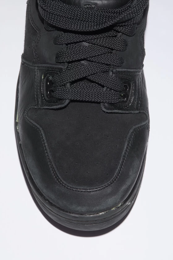 Acne Studios multi/black low top lace-up sneakers feature a basketball-inspired construction. Crafted from leather with contrast suede and nubuck with a strong wash finish. Complete with distressed details and adorned with an Acne Studios logo.