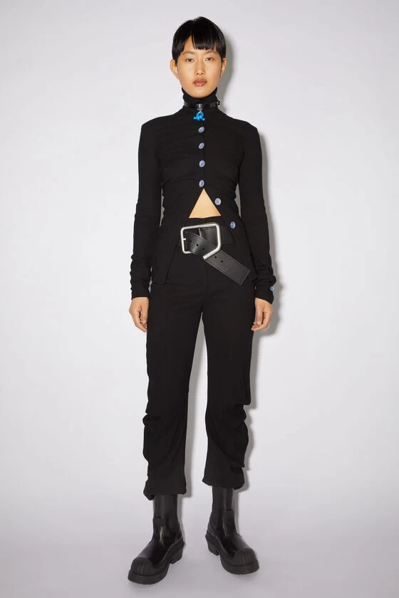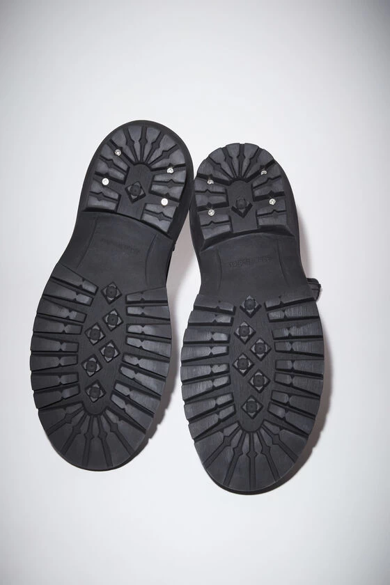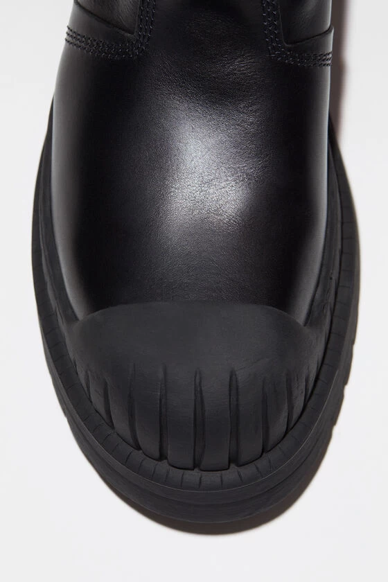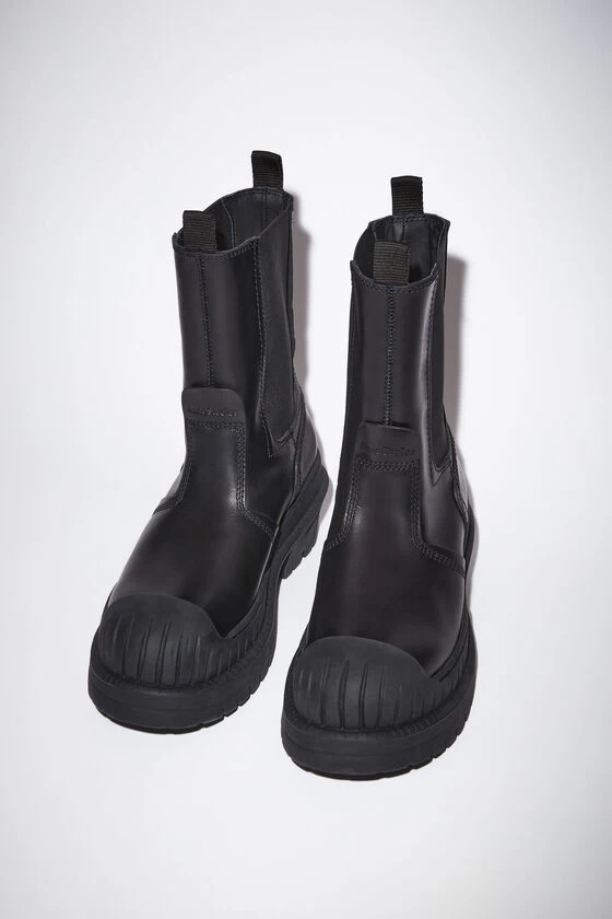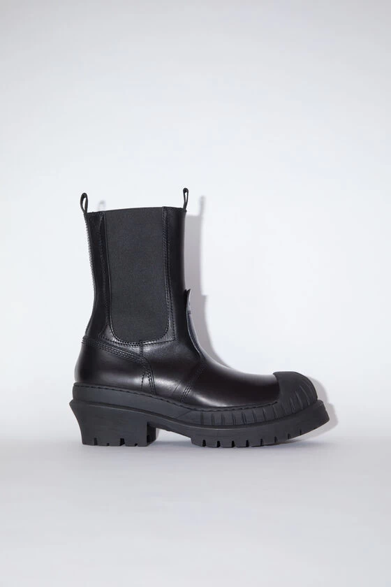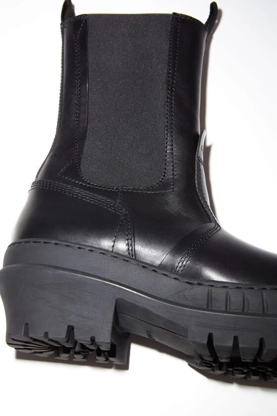 Acne Studios black/black elastic panel ankle boots are made of calf leather and feature thick rubber lug soles.