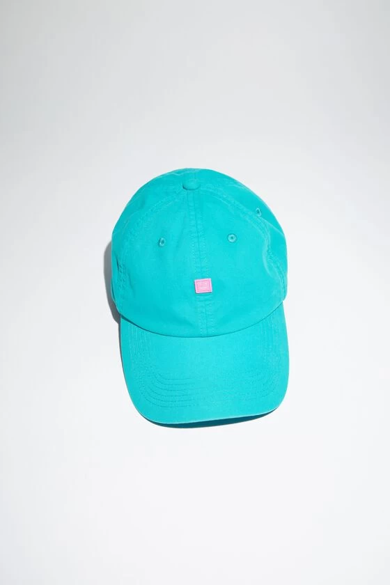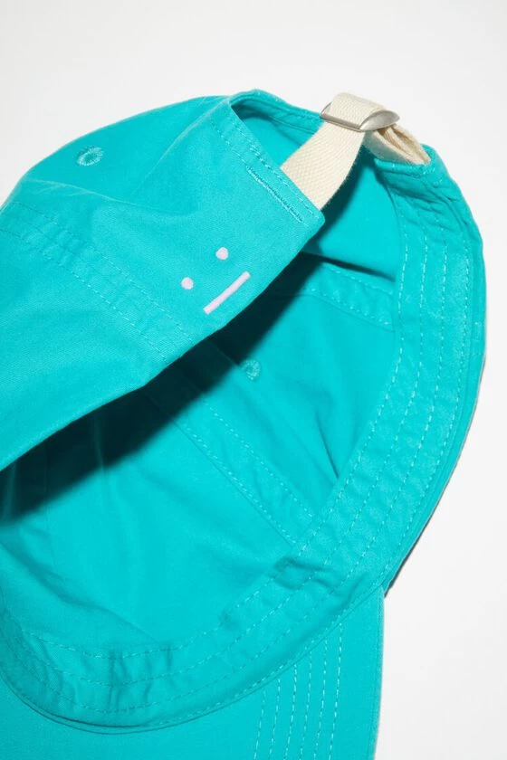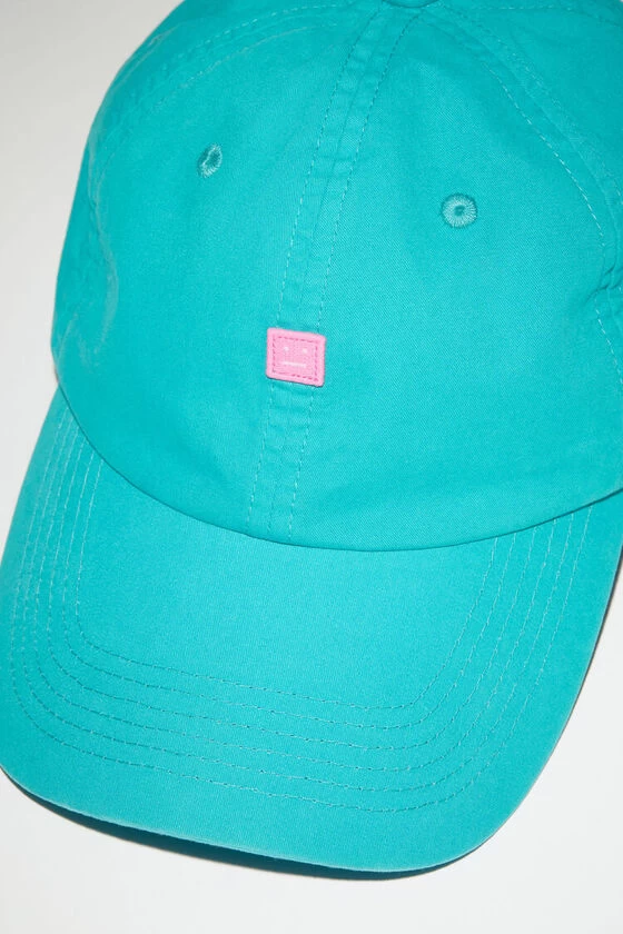 Acne Studios sea green six-panel baseball cap is detailed with a micro face logo patch and is made of cotton with a faded finish. Complete with an adjustable closure at the back.