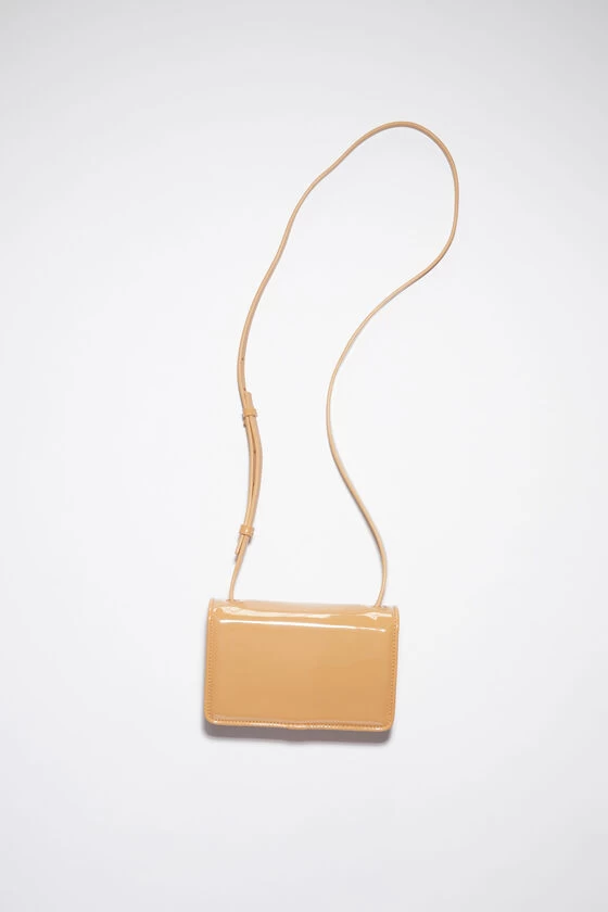 Acne Studios beige mini crossbody bag features a structured silhouette in a glossy finish with one zippered middle compartment, two open compartments and an interior card slot. Accentuated with contrast metal Face patch and adjustable strap.
