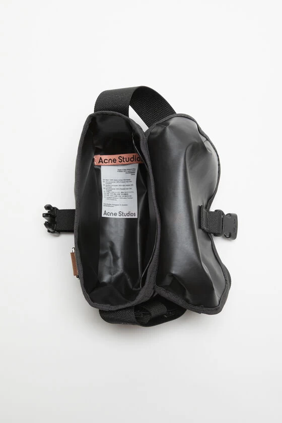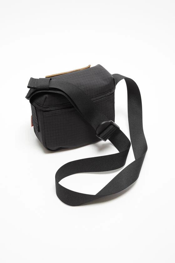 Acne Studios black mini messenger crossbody bag is crafted from nylon ripstop, detailed with a suede address tag and embossed Acne Studios logo.