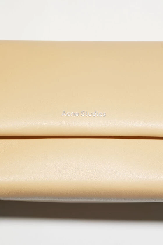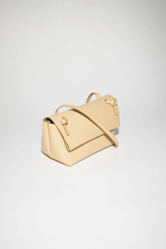 Acne Studios dune beige mini shoulder bag features side knot detailing with a voluminous silhouette crafted from soft leather. Completed with a silver tone Acne Studios logo stamp, discrete fold-over flap with a magnetic closure.