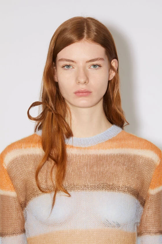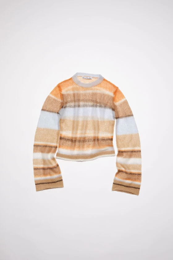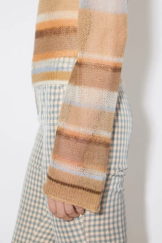 Acne Studios brown/multi crew neck jumper features a multi-coloured stripe pattern, crafted from a lightweight open-knit mohair blend. Cut to a regular fit with elongated sleeves and a regular length.