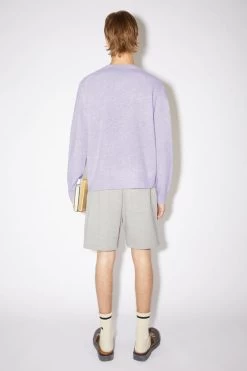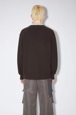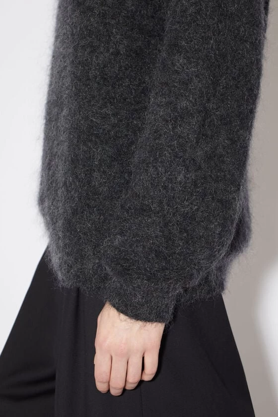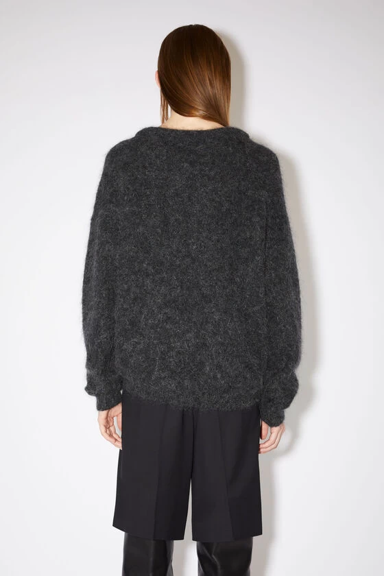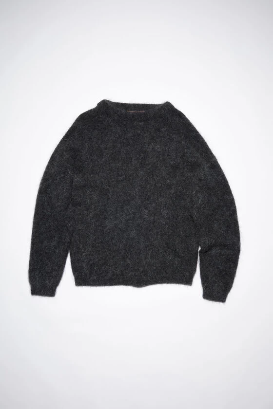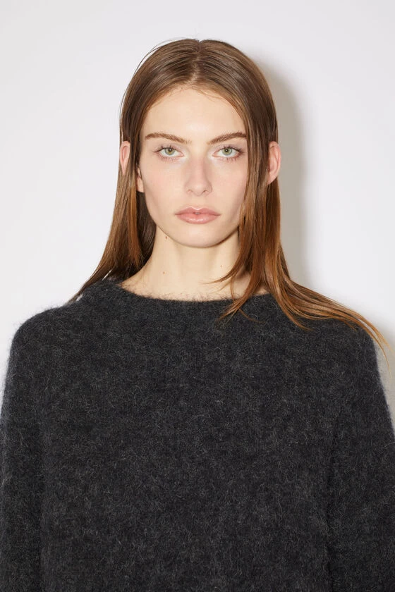 Acne Studios anthracite grey crew neck jumper is crafted from a fluffy mohair wool blend. Cut to a relaxed silhouette with dropped shoulders and elongated sleeves.