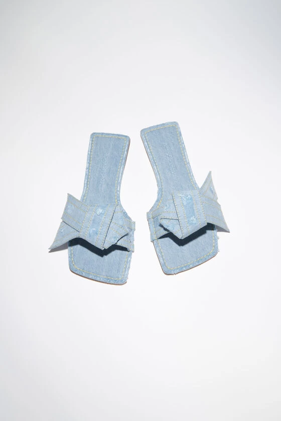 Acne Studios light blue sandal features a twisted musubi knot on the front, inspired by traditional Japanese obi sashes. Crafted from denim with distressed details and leather soles.