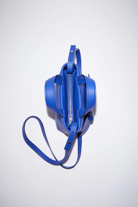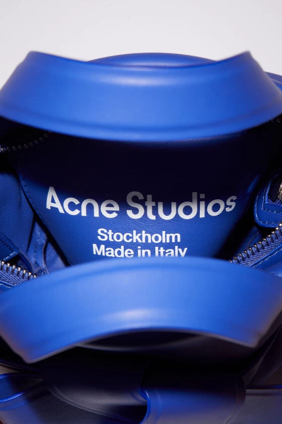 Acne Studios blue micro tote bag is made of soft leather and is adorned with twisted musubi knot on the front, inspired by traditional Japanese obi sashes. Completed with a middle zippered pocket compartment and a discrete zippered closure.